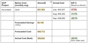 As mentioned previously, we aimed for a collective 10% savings across the top 10 spending GCP projects. We implemented the following steps for each project as a way to benchmark the cost optimization results: