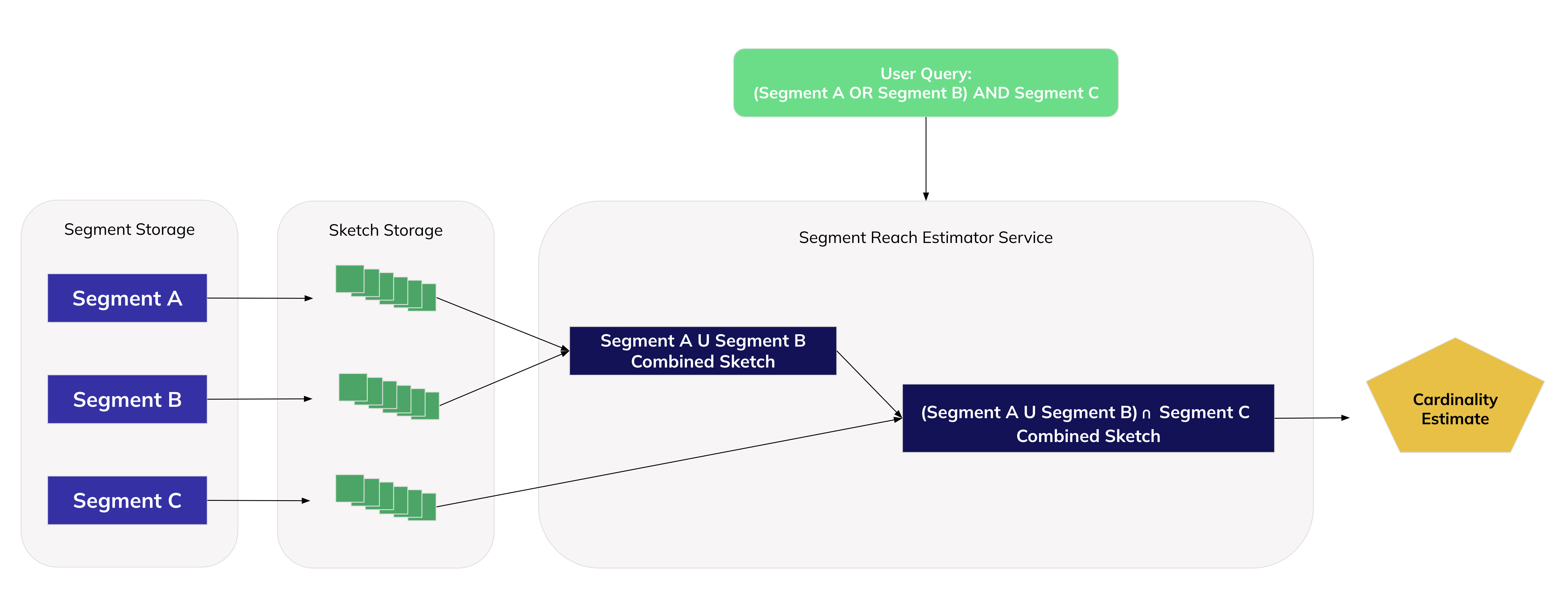 When a user submits a query for segment combination, the sketches for the segments involved in that query are retrieved from storage and combined within milliseconds. The final sketch’s cardinality estimate is returned to the user in the UI where they can use its information to adjust the size and contents of their final audience.